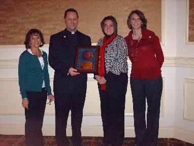 The representatives from St. Vincent de Paul pose on the opening day of the Blue Ribbon Ceremony, November 15, 2010. From left to right, Jenn Huss, technology instructor, Sarah Hogan, 3rd grade, Froncie Clubb, 3rd grade, Msgr. Jason Gray, pastor.