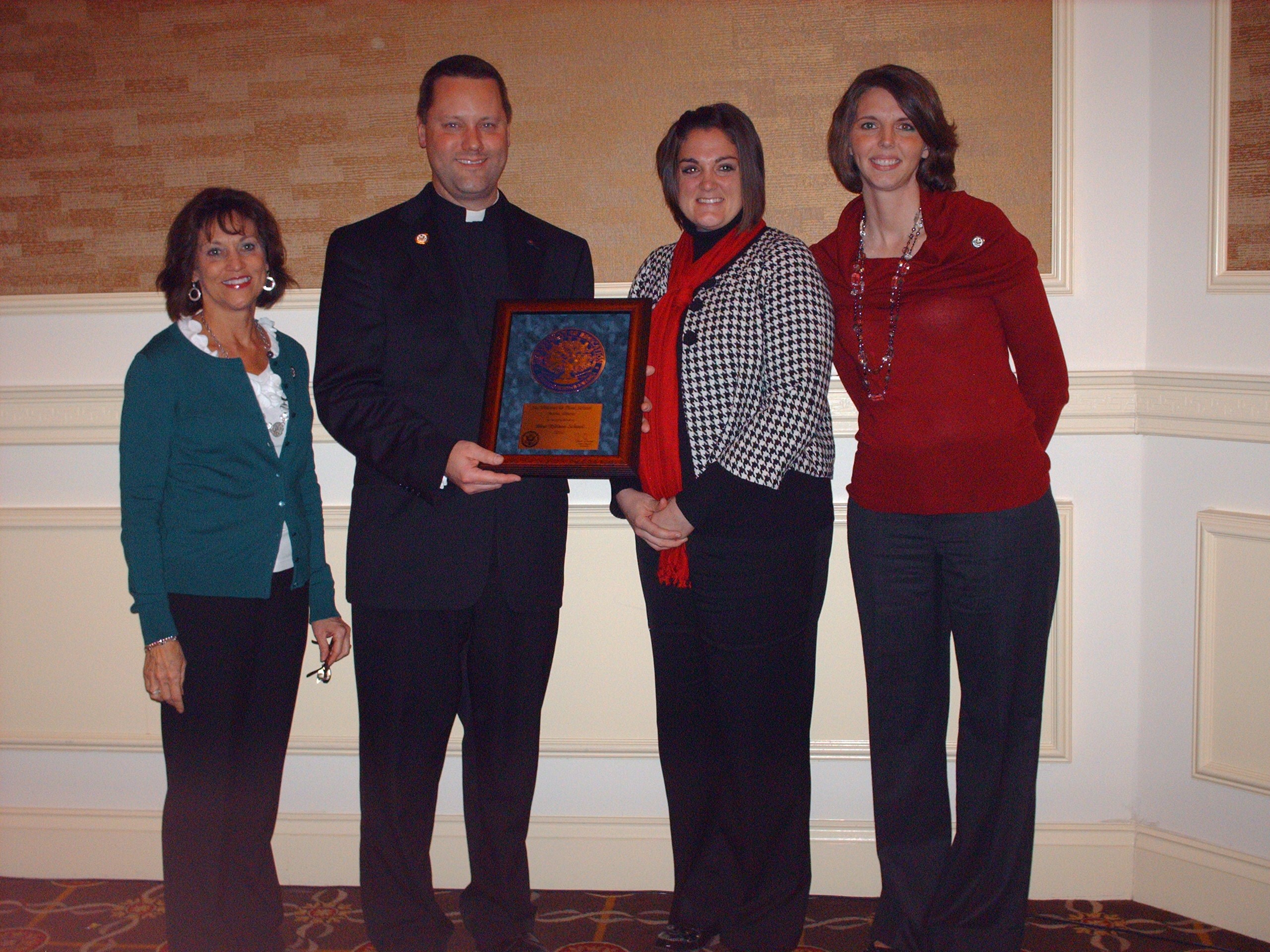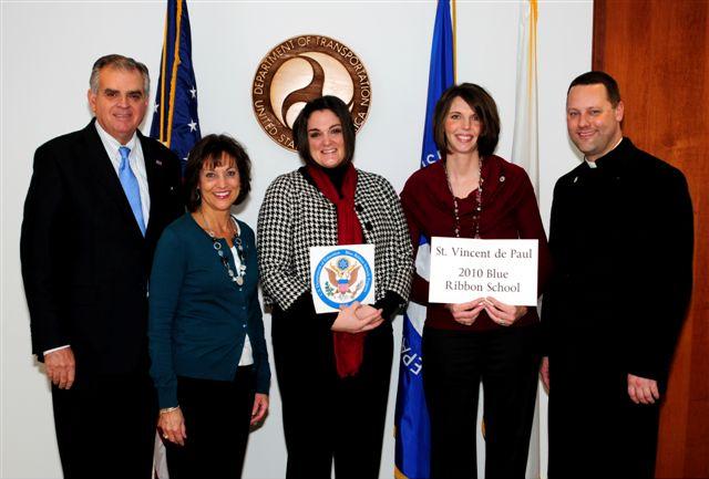 The representatives from St. Vincent de Paul with the Blue Ribbon plaque after receiving the award from Secretary Arne Duncan on November 16, 2010. From left to right, Froncie Clubb, 3rd grade, Msgr. Jason Gray, pastor, Sarah Hogan, 3rd grade, Jenn Huss, technology instructor.